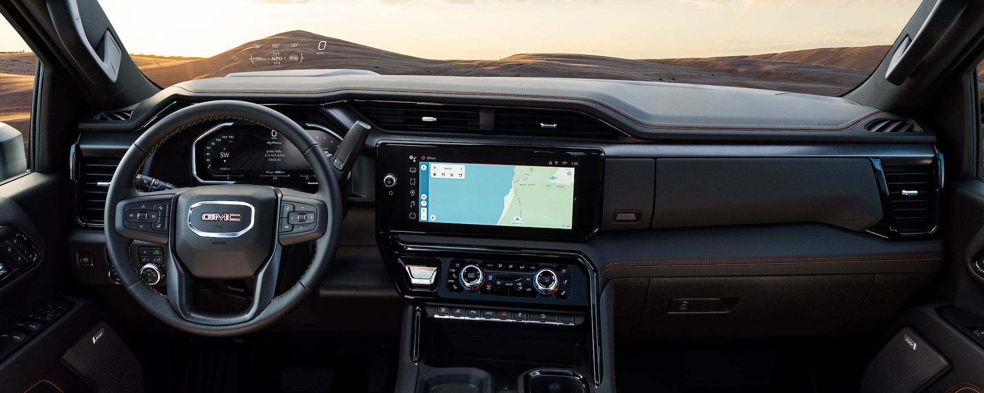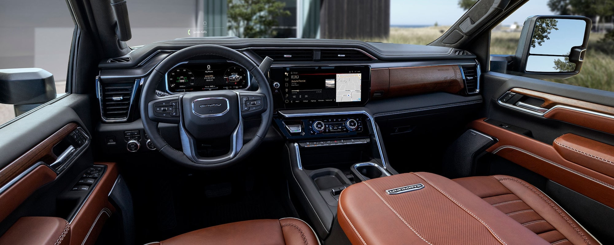 Sierra HD Denali Ultimate's Alpine Umber interior features full-grain leather seating, plaited contrast stitching, and embossed and laser-etched topographical map patterns of its namesake's mountain summit.